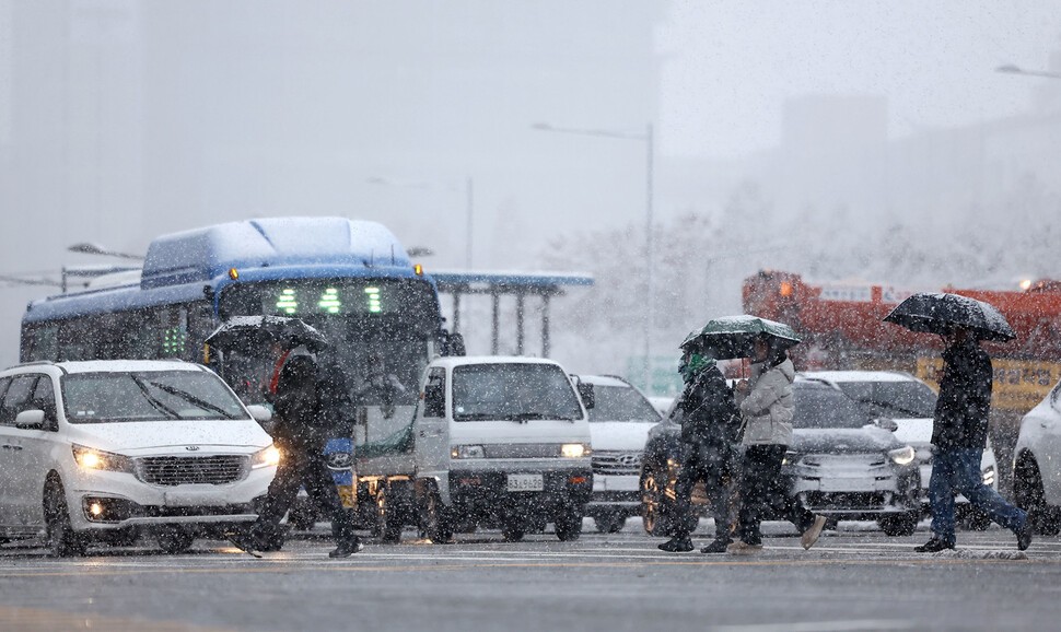 지하철 역사 출입구와 버스 정류장에서 미끄럼 사고를 예방하기 위해 신속한 제설 작업이 진행되고 있습니다.