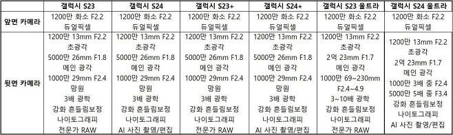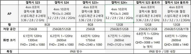 화면은 크기가 조금 더 커지고 최대 밝기는 2600니트로 늘어나 한낮에도 선명한 화면을 제공합니다. 갤럭시 S24는 6.2인치, 플러스는 6.7인치 화면을 탑재합니다. 울트라는 6.8인치 해상도 화면을 탑재했습니다. 세 제품 모두 동일하게 IP68급 방수를 지원합니다.