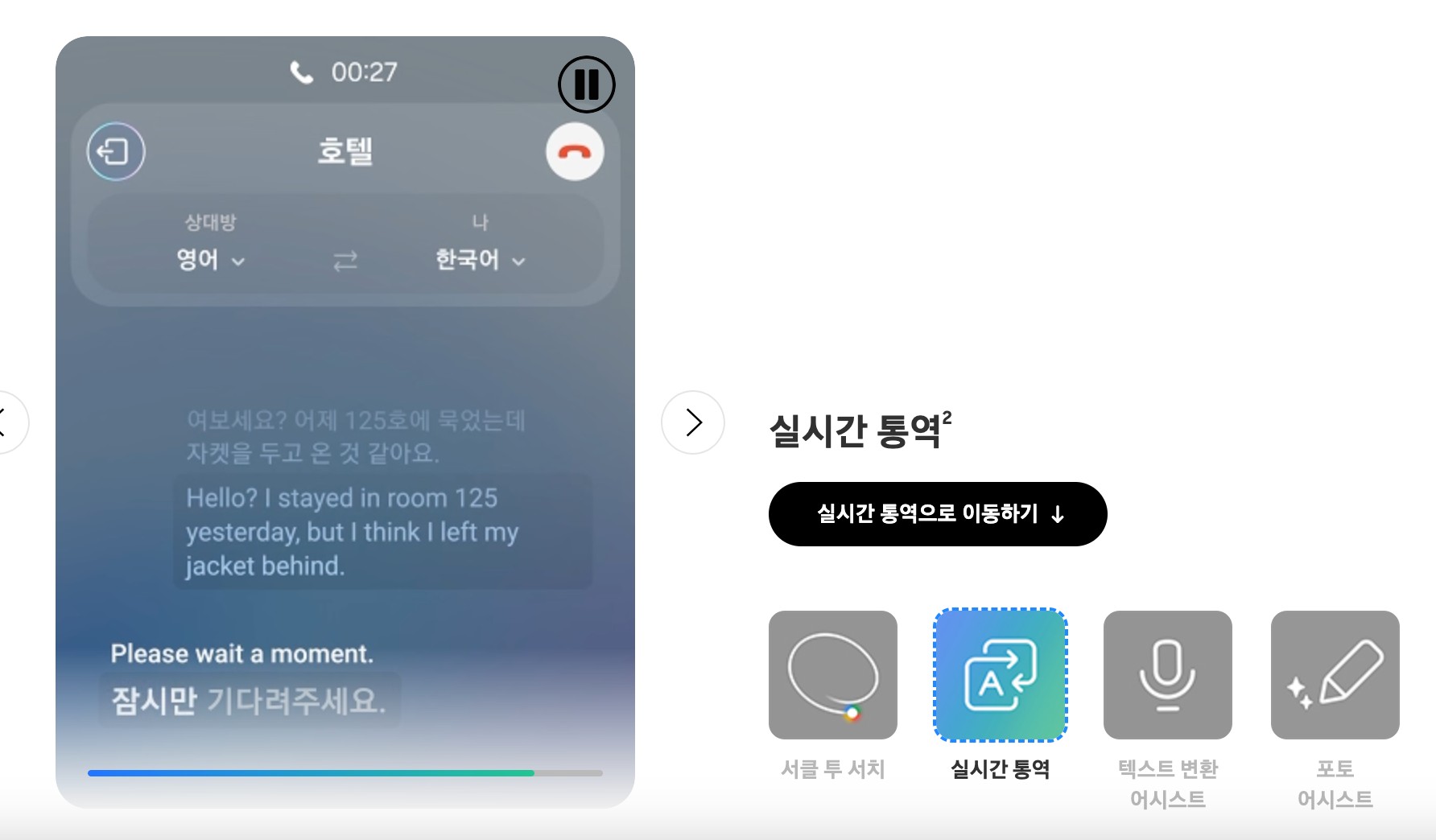 갤럭시 S24 시리즈는 실시간 통화 번역부터 시작해 '서클 투 서치', '노트 어시스트' 등 다양한 인공지능 기능을 지원합니다. 통화 중 영어, 일본어 등 13개 외국어를 실시간으로 통번역하는 실시간 통역 기능을 지원합니다. 이 실시간 번역 기능은 문자에서도 가능합니다.