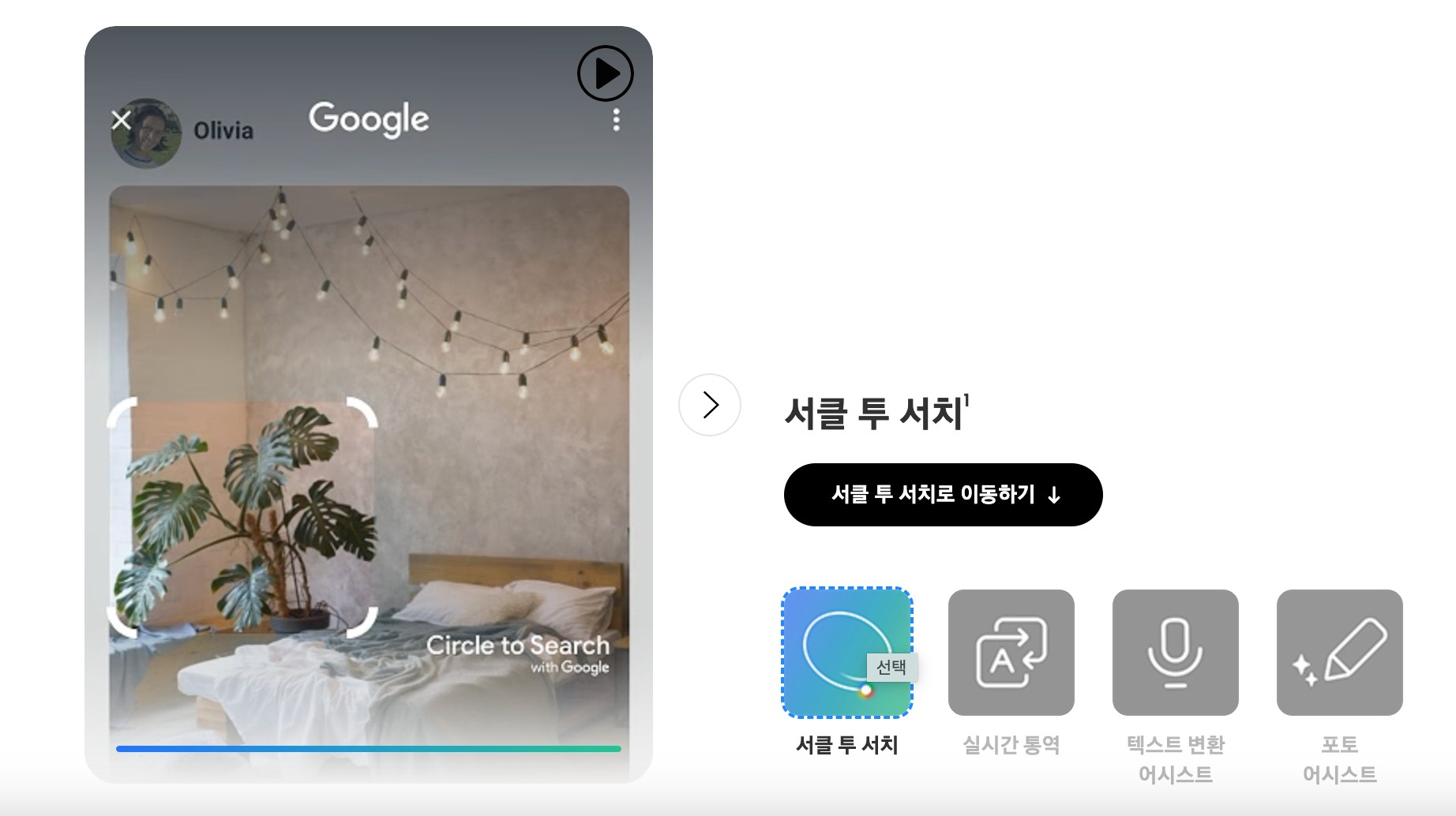 서클 투 서치 기능은 화면에 동그라미를 그리면 AI가 해당 정보를 빠르게 검색해 주는 기능입니다.