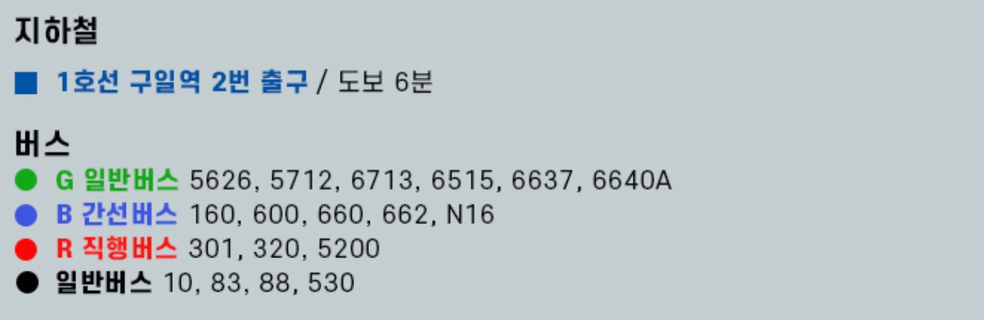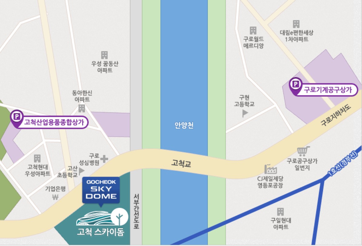- 고척산업용품종합상가: 800m 거리(도보 10분)/ 24시간 오픈/ 30분당 1,000원/ 주차면수 약 1,000면