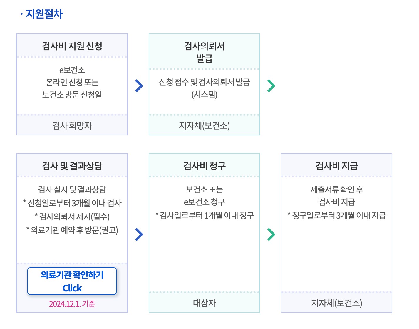 - 검사 후, 해당 의료기관에서 발급한 진료비 영수증 및 세부내역서를 관할 보건소 방문 제출 및 e보건소 온라인 제출을 통해 지원금을 신청할 수 있습니다.