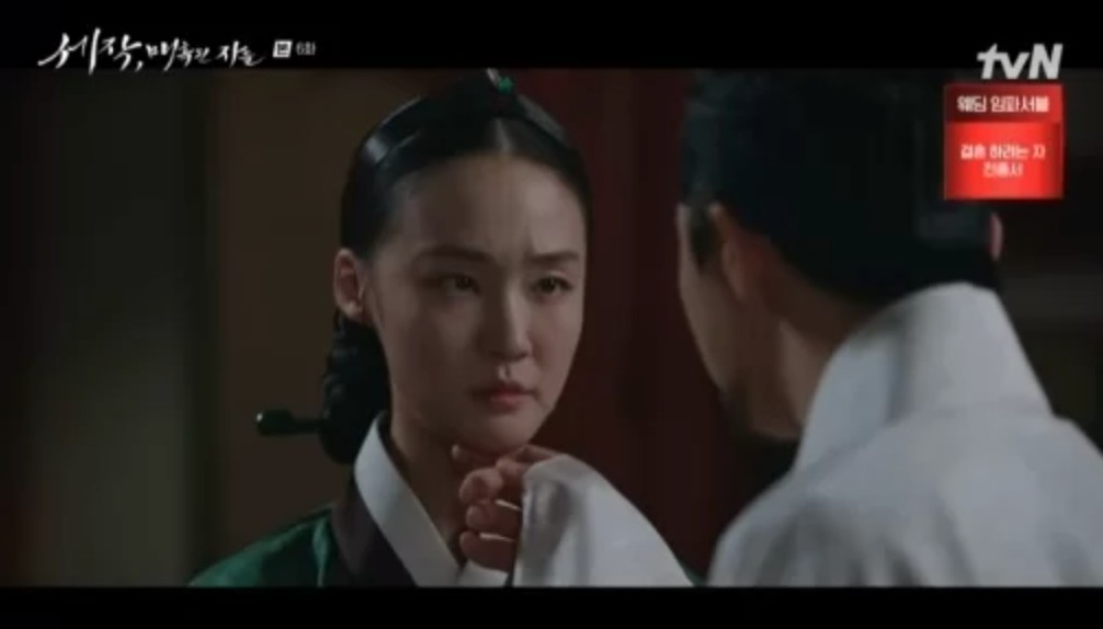 중요했던 부분 중 하나는 동상궁(박예영)과 주상화(강홍석)의 갈등이었습니다. 기대령이 새로 입궐하고 동상궁은 탕약을 핑계로 영취정에 들어가려 하는데요. 영취정은 임금과 기대령이 바둑을 두는 곳으로 그 둘을 제외한 아무도 들이지 말라는 이인의 명이 있었습니다. 그런 영취정에 들어가려는 동상궁을 주상화가 막아서며 강하게 대립하는 모습을 보여주며 둘 사이의 갈등을 예고했습니다.