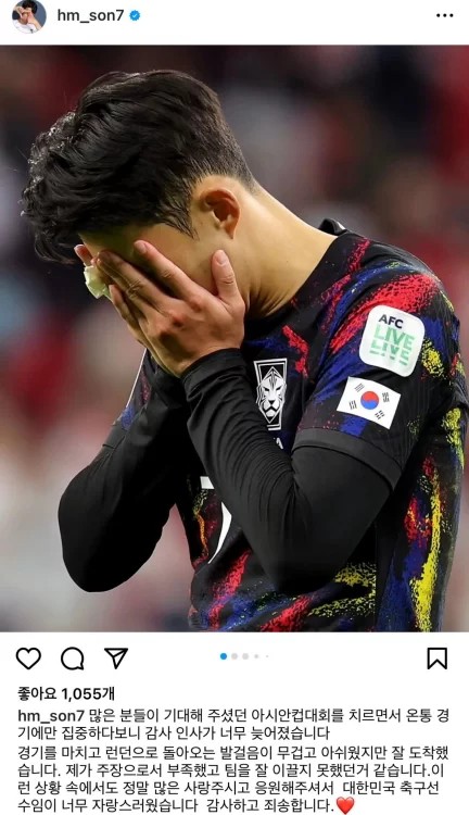 하지만 아시안컵 대회 종료 후 손흥민의 SNS에 올라온 글이 또 한 번 팬들의 마음을 철렁하게 했습니다. 손흥민은 소속팀인 토트넘에 복귀했다며 글을 올렸습니다. 주장으로서 부족했고 팀을 잘 이끌지 못했던 것 같다며 팬들에게 감사와 사과의 마음을 전했는데요. "이런 상황에서도 많은 사랑 주시고 응원해주셔서 대한민국 축구 선수임이 너무 자랑스러웠다. 감사하고 죄송합니다"라고 인사를 남겼습니다.