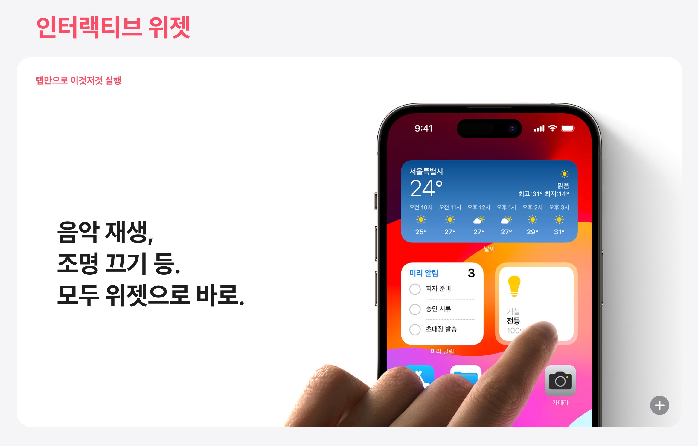 뿐만 아니라 스탠바이 모드도 추가되었는데요. '스탠바이' 모드는 아이폰을 가로로 놓고 충전 중일 때 다양한 정보를 한눈에 쉽게 확인할 수 있는 기능을 제공합니다. 침대나 주방에서 활용할 수 있으며 야간 모드도 지원합니다. 시리를 이용해서 더 큰 화면에서 이용할 수 있습니다.