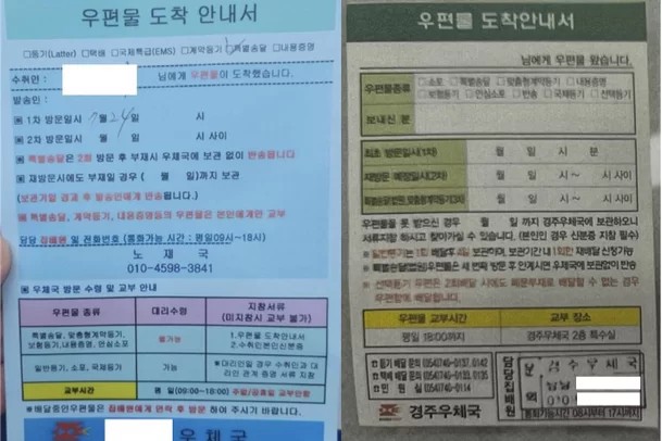 우편물 피싱은 사기꾼들이 위조 우편물을 사용자의 우편함에 넣거나, 우편물 도착안내서를 문 앞에 부착하여 사용자와 연락을 취하려는 방식입니다. 이러한 우편물 도착안내서는 등기우편물이 수취인 부재 등으로 인해 배달되지 못할 때 사용자에게 우편물 도착 사실을 알리기 위해 부착하는 안내문입니다.
