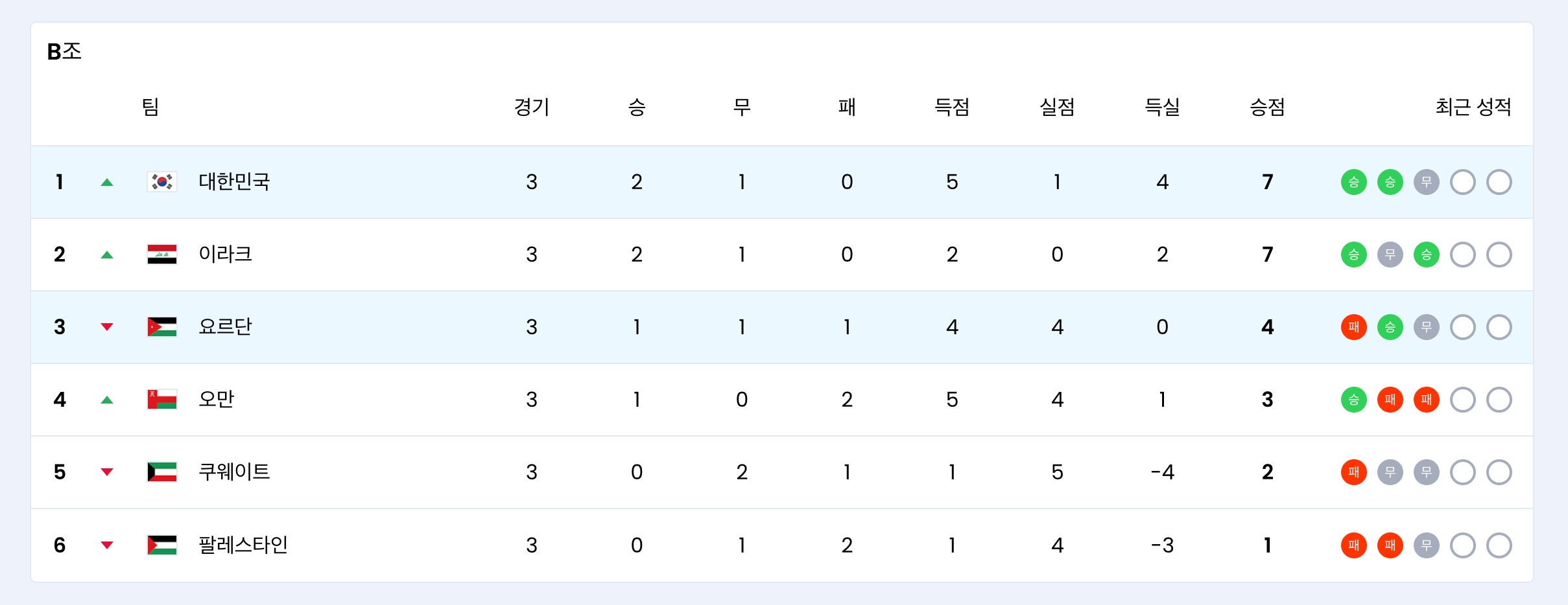 한국은 요르단과의 경기에서 승점 3점을 챙기며 총 승점 7점으로 B조 선두에 올랐습니다. 이라크도 승점 7점으로 같이 선두에 올랐지만 골득실에서 한국이 +4, 이라크가 +2로 한국이 조금 앞서있는 상황입니다. 오늘 경기로 어떻게 순위가 바뀌었는지 확인해보세요.