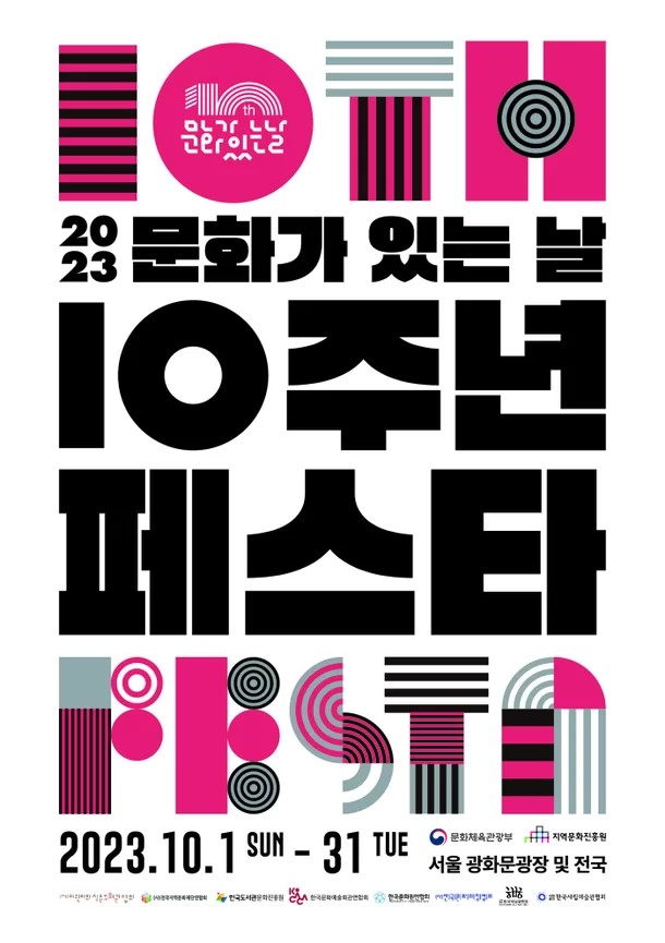 2023 문화가 있는 날 10주년 페스타는 국민들의 일상을 풍요롭게 채워줄 다채로운 문화 경험과 혜택으로 가득한 축제입니다. 가족, 친구와 함께 즐기는 쉼표가 되어줄 이 특별한 축제에 참여해 보세요!