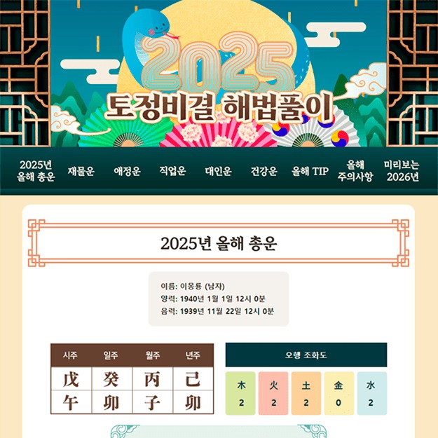 2. 2025년 무료 토정비결을 제공하며, 양력과 음력을 기반으로 한 무료 토정비결 운세를 보고 행복한 한 해를 기원할 수 있는 사이트입니다.
