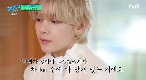 뷔는 아버지에 대한 감사의 마음을 고백했습니다. 그는 "아빠가 오래 옷 장사를 하셨어요. 옷을 사오려면 새벽에 서울로 가서 옷을 사 오셨어요. 그래서 첫 정산을 받고 아버지의 차를 바꿔드렸다"고 말했습니다. 뷔는 "그 이후로도 두 번 바꿨다. 지금은 제일 좋은 것"이라고 말했습니다. 이에 조세호는 "불효자는 운다. 아버지가 골프 치신다고 하시길래 허리 다치신다고 했다"라고 말해 웃음을 안겼습니다.