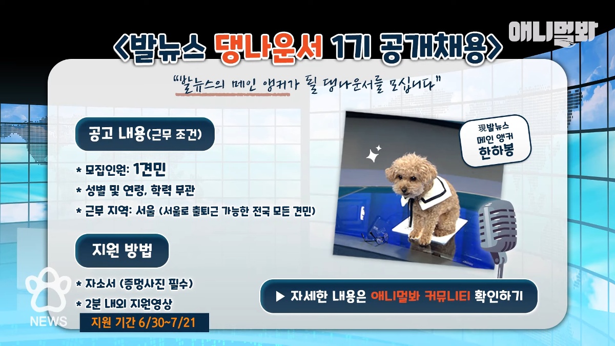 SBS 유튜브 채널 애니멀봐에서 귀여운 강아지 아나운서들 댕나운서를 공개 채용한다고 합니다. 아래 조건 확인하시고 우리 강아지 뉴스 댕나운서 진출 시키고 싶으신 분들은 신청해보세요!